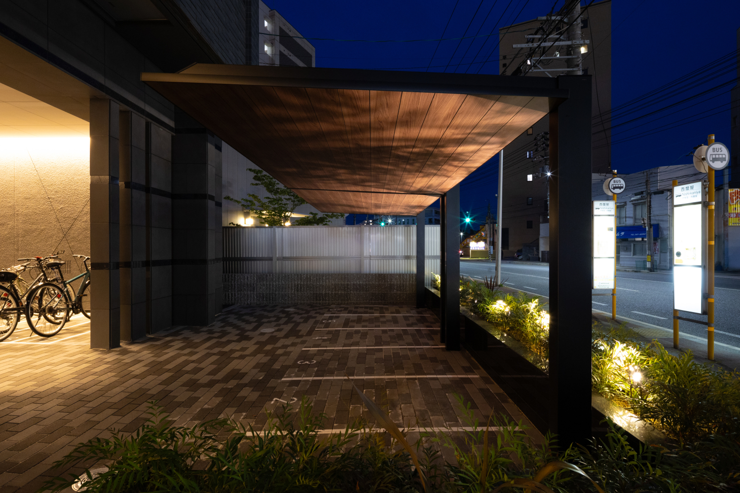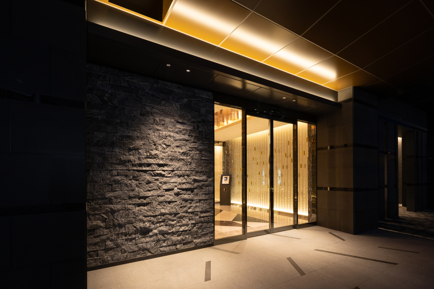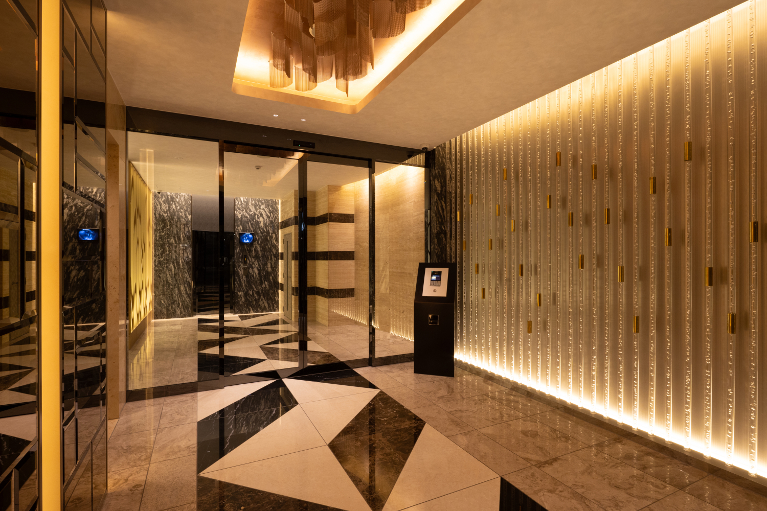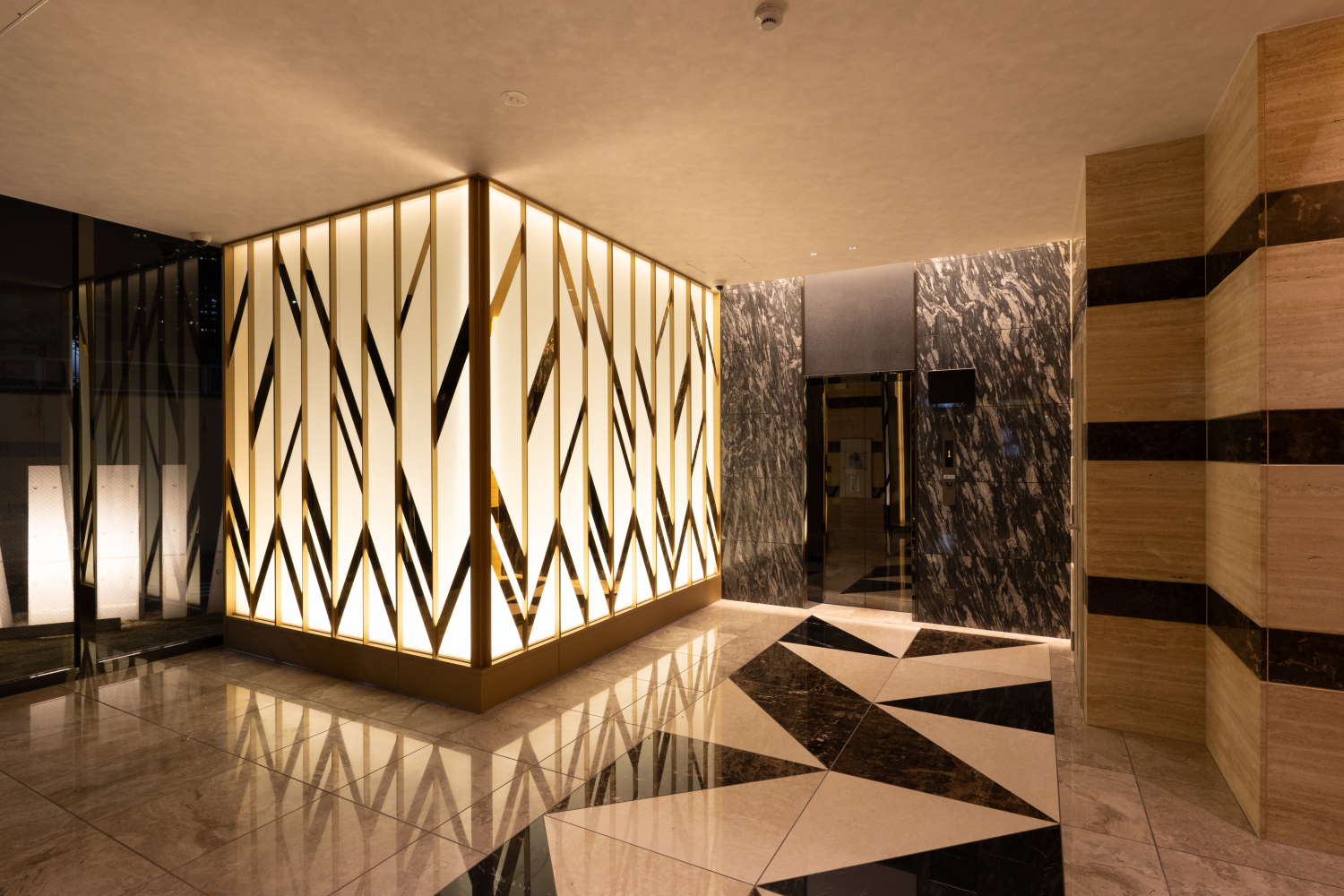 A volume of light spread across an entire wall is composed to emerge repeatedly through a variety of materials. The diagonal motif that appears on the approach floor is carried forward seamlessly onto the wall. As copper and gold surfaces catch and reflect the light, a golden-tinted glow softly shimmers and diffuses through the space, creating a gentle sense of fluctuation. The layered motifs rise as a patchwork, and through their presence they are intended to shape the atmosphere of the place.