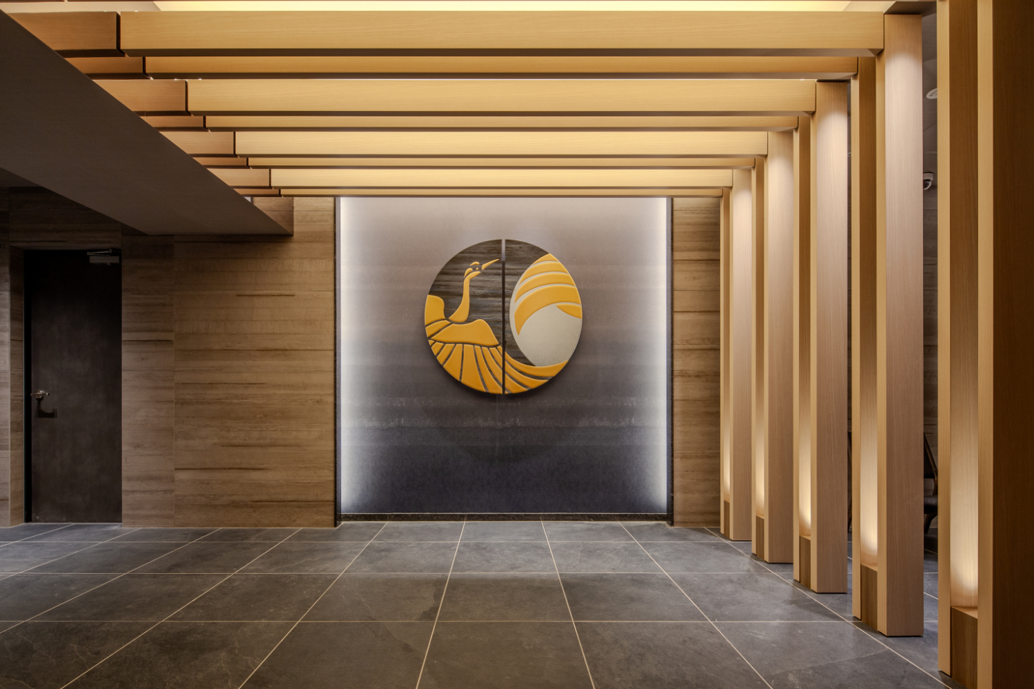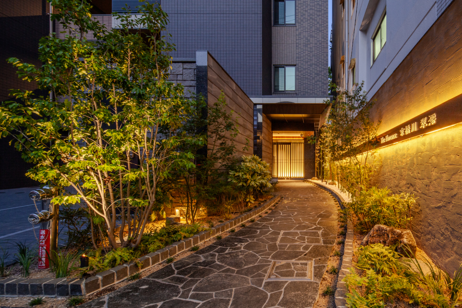 奥行きをもったアプローチには土壁仕上げの壁面を設け、その面に沿って水平に連続する光を上下に配置した。これらの光はアプローチへの導線となると同時に、足元の植栽をやわらかく照らし、前面道路からのアクセス時にはアイキャッチとしても機能する。ホールでは、木組み架構をモチーフにした意匠として鳥居を想起させるフレームを連続させ、空間にリズムと奥行きを与えている。